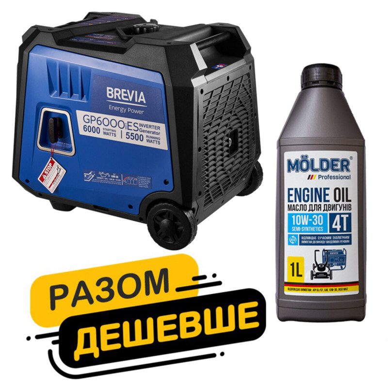 Комплект генератор Brevia інверторний бензиновий 6,0кВт з електростартером GP6000iES + масло Molder Engine Oil 4T 10W-30 1л