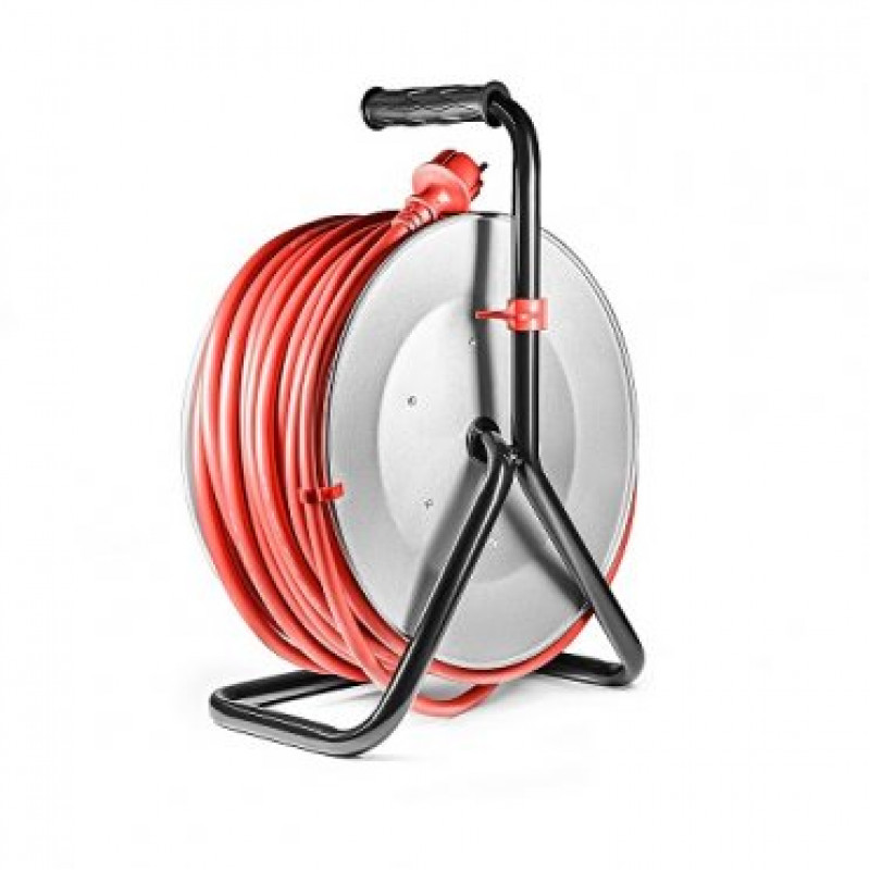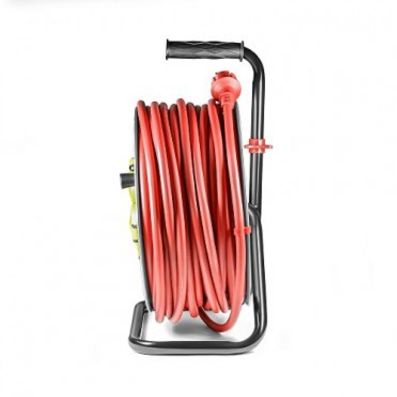Металева котушка призначена для тривалого терміну експлуатації. Завдяки котушці подовжувач легко розмотується для роботи та змотується для компактного зберігання. Обладнаний ручкою, що дозволяє легко переміщувати подовжувач. Ніжка забезпечує максимальну стійкість у процесі роботи.