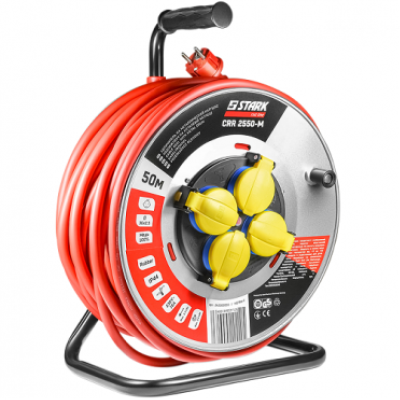 Stark CRR-2550-M – подовжувач на металевій котушці для підключення до мережі електроінструментів, садової техніки. Котушка обладнана 4 розетками європейського стандарту із захистом від дітей.