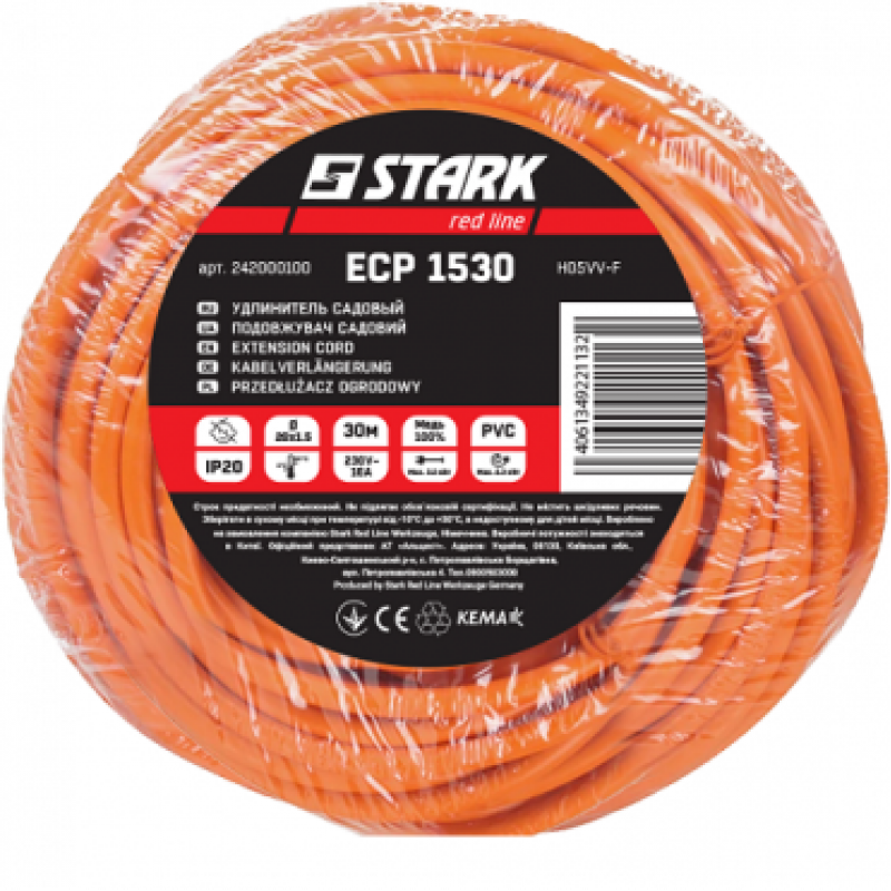 Завдяки ПВХ ізоляції подовжувач безпечний, тому що є трудновоспламенімим. Stark ECP 1530 сертифікований і відповідає європейським стандартам.