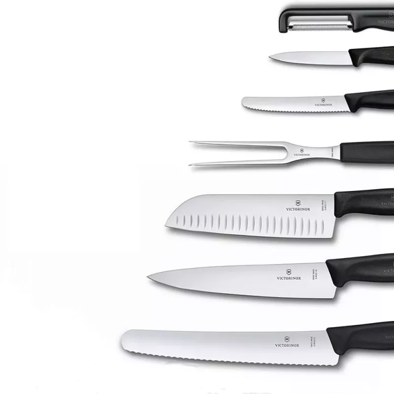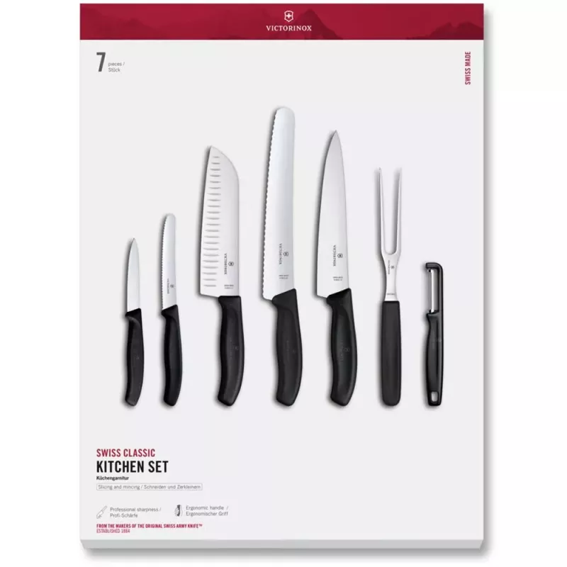 Цей універсальний набір з 7 предметів включає набір професійних гострих лез з нержавіючої сталі, вилку для нарізки та овочечистку — кожен предмет створений для точного виконання будь-яких кухонних завдань. Легкі ергономічні ручки забезпечують надійне та зручне захоплення. Цей набір виготовлений у Швейцарії і підходить для миття в посудомийній машині, поєднуючи довговічність і простоту догляду.