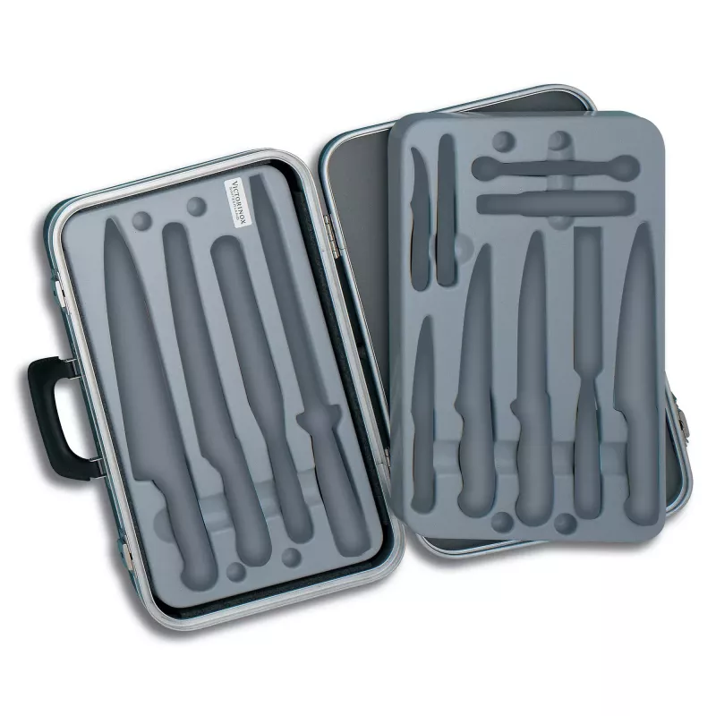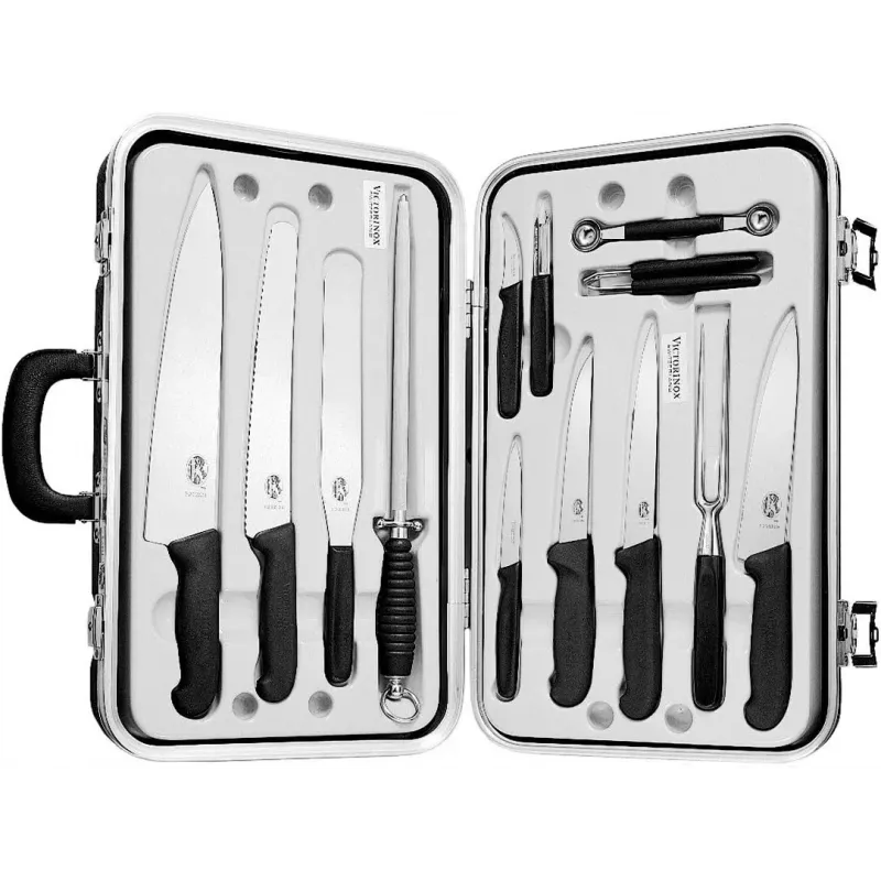 | Victorinox | Victorinox Fibrox Small Chef's Case - набір із 14 предметів. Постачається в оригінальному боксіорганайзері. Професійна якість від швейцарської компанії Victorinox. Ергономічні ручки зі стабільним хватом і професійне заводське заточування для легкої і продуктивної експлуатації. Леза чудово ріжуть і довго зберігають гостроту.