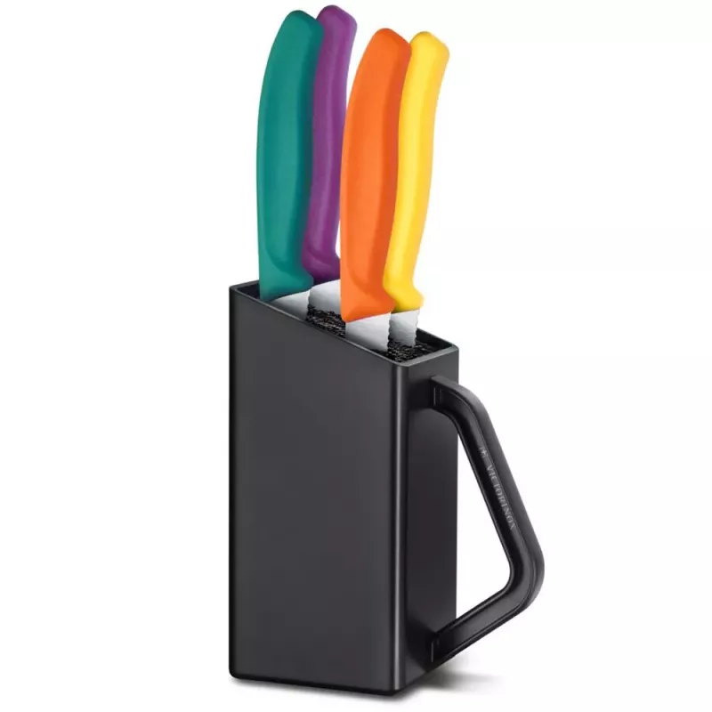 Кожен із п'яти ножів у цьому блоці має професійне гостре лезо з хвилеподібним заточуванням, розроблене для плавного нарізування стейків та піци. Кожен ніж має ергономічні ручки для зручного захоплення, а блок забезпечує зручне зберігання. Ці ножі, виготовлені в Швейцарії та підходять для миття в посудомийній машині, відрізняються довговічністю, точністю та легкістю догляду.