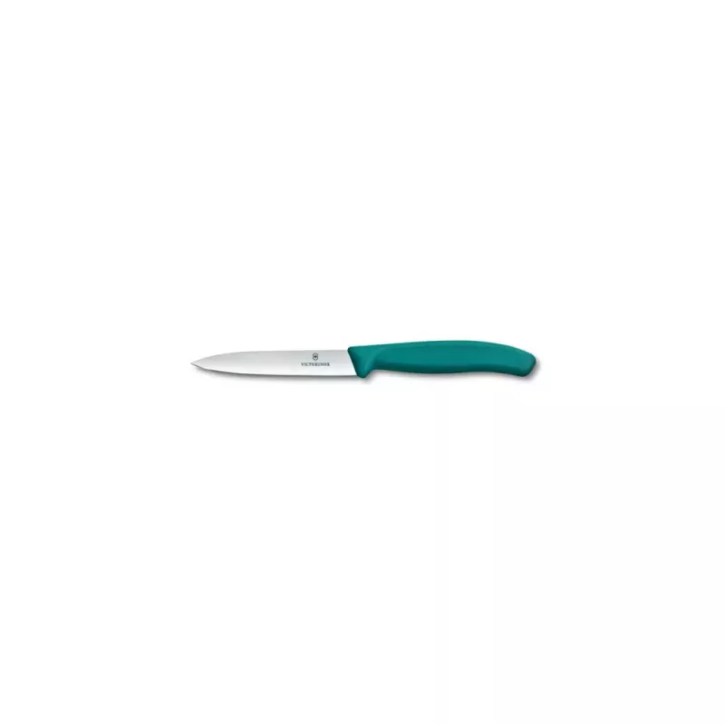 Цей ніж для чищення овочів оснащений професійним гострим лезом з нержавіючої сталі з прямою кромкою та загостреним кінчиком, що ідеально підходить для широкого спектру точних завдань з приготування їжі. Його легка ергономічна ручка забезпечує максимальний комфорт та контроль. Виготовлений у Швейцарії та підходить для миття у посудомийній машині, забезпечуючи надійність та ефективність для щоденного використання на кухні.