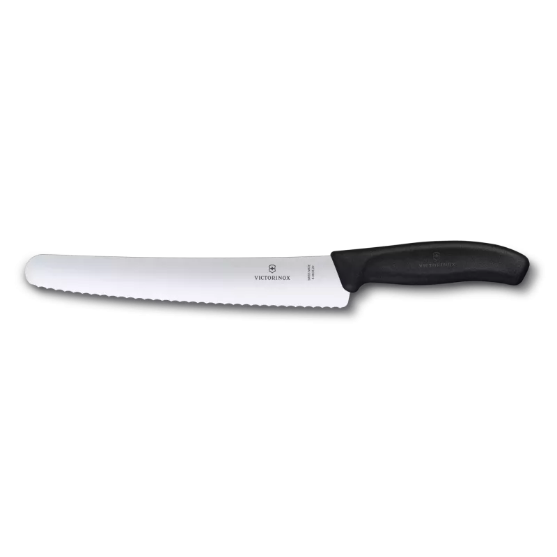 Цей ніж для хліба та випічки оснащений професійним гострим лезом із нержавіючої сталі з хвилеподібною кромкою, яка легко нарізує випічку. Легка ергономічна ручка забезпечує комфорт та контроль при використанні. Виготовлений у Швейцарії та підходить для миття у посудомийній машині, він надійний та довговічний.