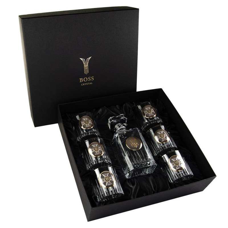 Набір для віскі "МНС" 6 келихів 360 мл, графін 750 мл, кришталь з платиною, зображення зі срібла з позолотою