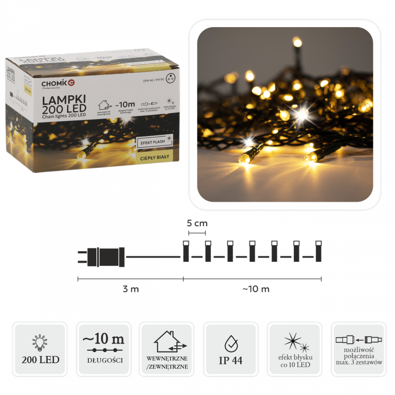 Гірлянда Chomik з 200 теплими білими LED-лампами — це універсальний варіант для святкового оформлення як приміщень, так і відкритих ділянок під навісом. Її довжина складає 13 метрів, з яких 10 м — основна частина зі світлодіодами, а 3 м — додатковий кабель без ламп для зручного підключення до мережі. Завдяки щільному розміщенню лампочок (кожні 5 см), світло розподіляється рівномірно, створюючи м’яку та затишну атмосферу. Зелений провід непомітний серед гілок ялинки або садових рослин, тому гірлянда гармонійно вписується в природне або святкове оформлення.