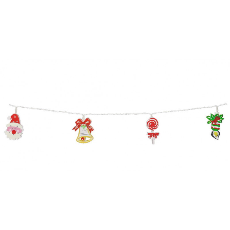 Гірлянда електрична Chomik з теплим білим світлом — це ефектне доповнення до святкового декору, яке створює атмосферу затишку й радості. Вона виконана у форматі нитки з десяти світлодіодних ламп, прикрашених оригінальними фігурками: від Санти з мішком подарунків до різдвяної тростини та сніговика. Загальна довжина гірлянди складає 1,65 метра, що дозволяє використовувати її для прикрашання невеликих зон у приміщенні. Сріблястий мідний дріт легко гнеться, зберігаючи форму, тому його зручно розміщувати навіть у складних композиціях. Живлення від батарейок (2×AA) забезпечує автономність, завдяки чому гірлянда не потребує розетки та може бути встановлена в будь-якому зручному місці.