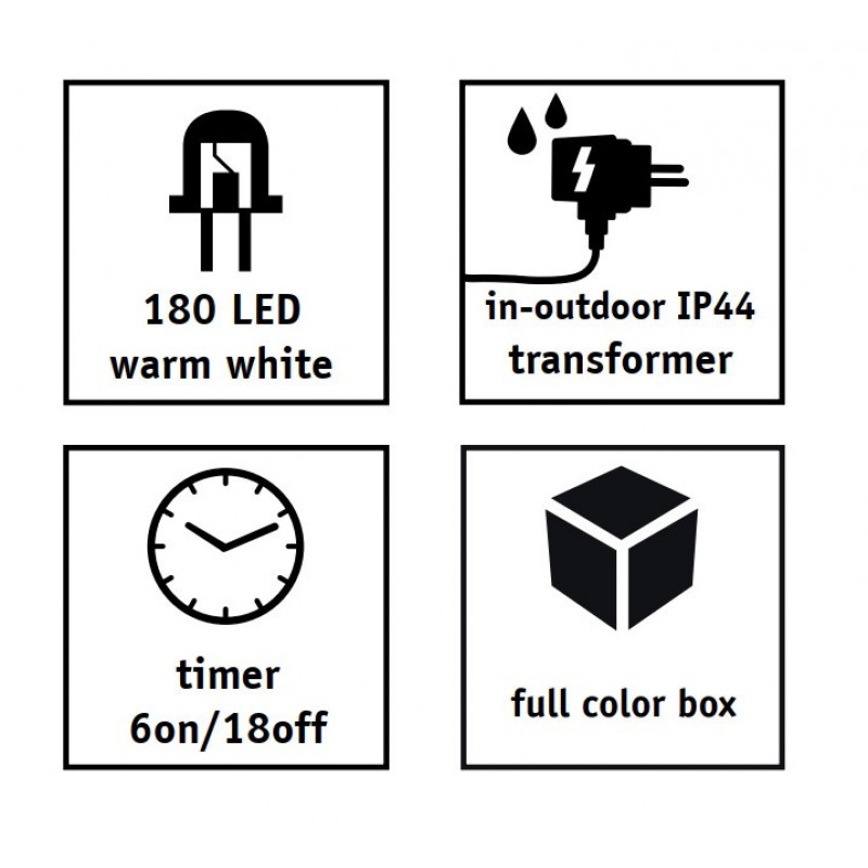 180 сяючих LED лампочок забезпечать різноманіття вражень та емоцій від святкової прикраси. Зелений дріт гірлянди залишається майже непомітним на різдвятому дереві, що викликає ефект невагомості LED-вогників. Відрізняється підвищеною яскравістю, надійністю та довговічністю. Обладнана таймером, при задіюванні якого, після 6 годин безперервної роботи вимикається на 18 годин.