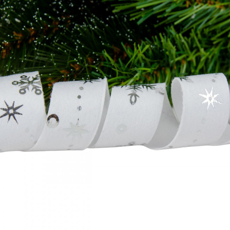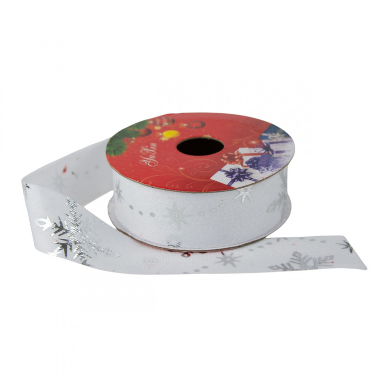 Біла текстильна основа з делікатним сріблястим візерунком сніжинок створює враження снігової свіжості, що робить стрічку доречною для зимового оформлення.