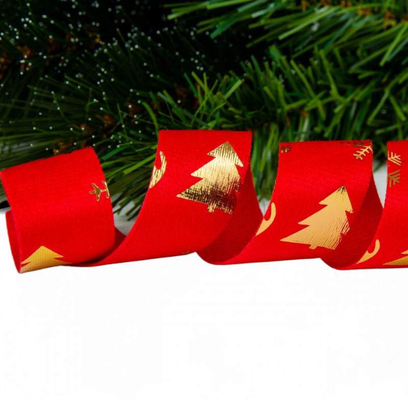 Яскрава текстильна стрічка Chomik червоного кольору з принтом у вигляді золотистих сніжинок і оленів створена для того, щоб додати атмосфері тепла та свята. Її довжина 2,7 метра дозволяє реалізувати безліч ідей декору — від упаковки подарунків до оформлення інтер'єру. Завдяки насиченому кольору й виразному орнаменту, стрічка ефектно виглядає як на ялинці, так і в композиціях із натуральною або штучною хвоєю.