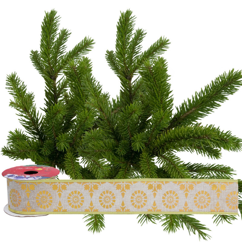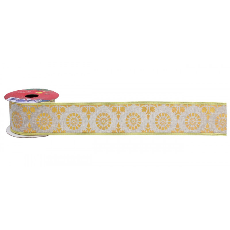 Декоративна стрічка Chomik із серії "Коло" — це текстильний елемент із золотистим орнаментом, який додає композиціям урочистого вигляду та акцентованої виразності. Завдяки витонченому малюнку у вигляді круглих мотивів, стрічка виглядає благородно і підходить для декору в класичному та сучасному стилях. Ширина 5 см забезпечує універсальність у використанні, дозволяючи застосовувати стрічку як для основних елементів декору, так і для дрібних оформлювальних деталей. М’яка текстура тканини добре тримає форму, а золотисте покриття забезпечує ефект м’якого блиску при освітленні.