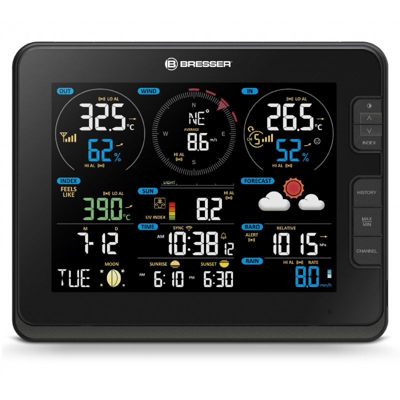 Сучасна професійна метеостанція з кольоровим дисплеєм і прогнозом погоди Bresser Professional WIFI Weather Centre 7in1 (WSX3001C) забезпечує вимірювання таких важливих метеопараметрів як величина атмосферного тиску, прогноз погоди, швидкість та напрям вітру, рівень опадів, рівень комфорту в приміщенні, інтенсивність випромінювання ультрафіолетових променів (UV), інтенсивність світла, температура та відносна вологість повітря. Функціонал станції дозволяє через WIFI обмінюватись даними на порталах: Weather Сloud, Weather Underground, онлайн переглядати дані на смартфоні, планшеті чи комп'ютері. Вбудована функція тривожних сповіщень попередить вас про вихід вимірюваних параметрів за вказані межі. Усі датчики скомпоновані в єдиному блоці, що значно спрощує та прискорює процес встановлення та монтажу, в комплекті додатковий безпроводний датчик температури і вологи. Зовнішній блок датчиків має сонячну панель для безперебійного і тривалого живлення. Сучасний висококонтрасний кольоровий дисплей. Сучасний лаконічний дизайн та широкий спектр функцій дозволить з рівним успіхом використовувати цю метеостанцію як у квартирі, так і на присадибних ділянках.