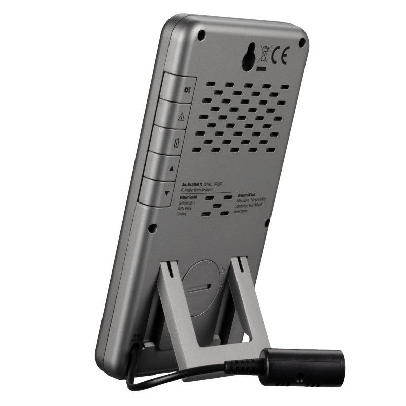 BRESSER RC Neomeo V silver — компактна бездротова метеостанція у стильному срібному кольорі, розроблена для тих, хто хоче завжди бути в курсі погодних умов як у приміщенні, так і надворі. Завдяки зручному кольоровому дисплею діагоналлю 14 см пристрій відображає повну картину мікроклімату вашого будинку та зовнішнього середовища в режимі реального часу. Метеостанція автоматично синхронізує точний час і дату через радіосигнал DCF, що позбавляє вас від ручного налаштування. Вбудований графічний прогноз погоди на 24 та 48 годин дозволяє планувати день наперед із максимальною впевненістю. Бездротовий датчик із захистом IP44 надійно працює на відстані до 80 метрів від базової станції та витримує вплив вологи й опадів. Зручний дизайн із можливістю як настільного, так і настінного розміщення робить цю метеостанцію ідеальним рішенням для будь-якого інтер'єру.