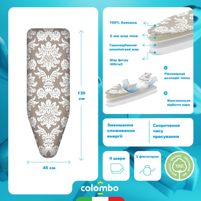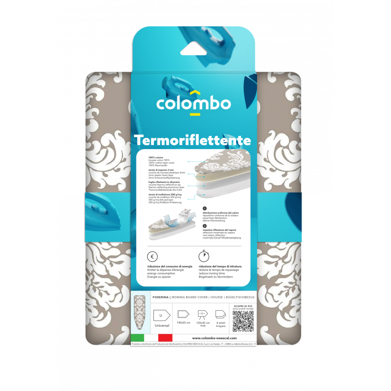 Чохол для прасувальної дошки Colombo Thermoreflectant 150 x 55 см (COP630) - інноваційний чотиришаровий чохол. За наявності такого чохла білизна прасується з двох сторін одночасно, оскільки пара і тепло праски відбиваються від поверхні дошки та повертаються на тканину. Завдяки цьому ви зможете скоротити час прасування та знизити енергоспоживання. Чохол виготовлений зі 100% бавовни. Підкладка з піноматеріалу завтовшки 3 мм забезпечує максимальний комфорт при прасуванні. Термовідбивний алюмінієвий шар. Чохол полегшує прасування та захищає білизну. Ідеально підходить для легкого прасування. Сучасний та елегантний дизайн. Легко та швидко надягається.