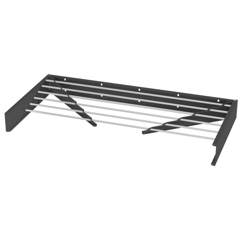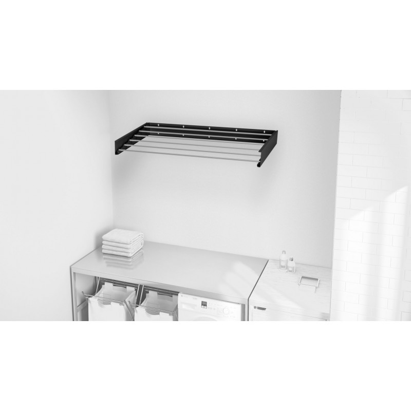 Сушарка складається «книжкою» або панеллю до стіни. Коли вона закрита, ви бачите лише охайну тонку планку. Ця модель сушарки пропонує близько 6 метрів корисної площі для розвішування .У закритому стані її товщина мінімальна, що дозволяє встановлювати її навіть за дверима або у вузьких душових зонах.