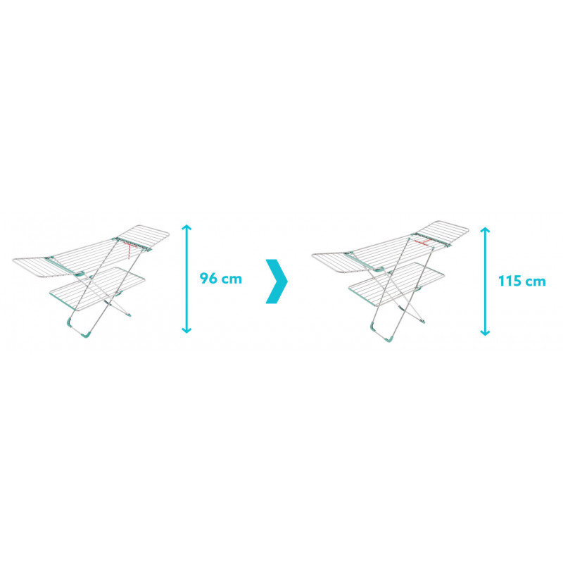 Сушарка для білизни підлогова Colombo Double (ST797) - практичне рішення, яке дозволить використовувати простір на всі сто відсотків. Завдяки подвійній системі розміщення робочих поверхонь, загальна довжина стрижнів становить тридцять метрів. Сушарка регулюється по висоті, що дозволяє за потреби розвішувати довгі речі. Модель повністю виготовлена з алюмінію, який стійкий до корозії та атмосферних явищ. Ніжки обладнані великими пластиковими накладками для захисту меблів та підлогових покриттів.