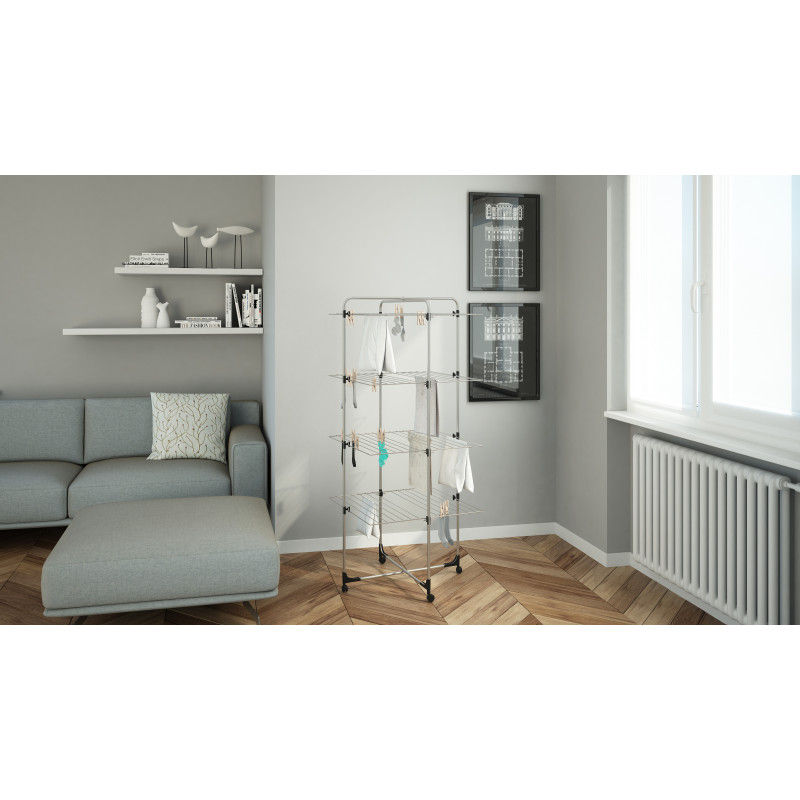 Сушарка для білизни підлогова Colombo Icaro 40 (ST194/4) - це чудовий компроміс між необхідністю сушіння великої кількості одягу та економією простору. Конструкція постачається в зібраному стані, вам достатньо тільки закріпити коліщата та пластикові накладки. Модульна система забезпечує можливість розміщення сушарки в душовій кабіні або біля стіни, склавши одну сторону. Сушіння довгих речей не є проблемою для Colombo Icaro 40, закріпіть речі за верхню секцію та складіть нижні, які перешкоджають вільному звисанню. Загальна робоча довжина поверхні сорок метрів, розрахована на максимальне навантаження до дванадцяти кілограмів.