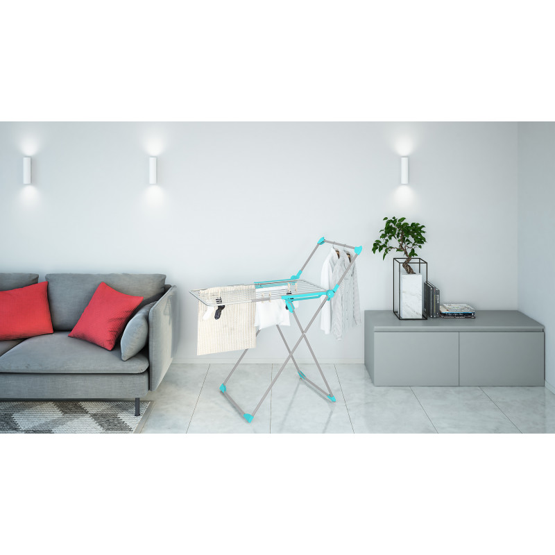 Сушарка для білизни підлогова Colombo Olympo (ST1010) - це компактна модель з сучасним дизайном, який підійде під будь-який інтер'єр. Робоча поверхня дозволяє легко розмістити одне повне завантаження пральної машини до восьми кілограмів. Тримач для плічок можна використовувати для сушіння постільної білизни чи інших об'ємних речей. Завдяки шарнірному механізму тримач можна скласти. Модель виготовлена з високоякісних матеріалів, які не піддаються корозії та атмосферним явищам. Ніжки обладнані коліщатами і пластиковими накладками.