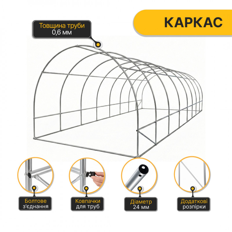 Каркас виготовлений з оцинкованих сталевих труб 24×0,6 мм, що гарантує високу міцність, стійкість до корозії та тривалий термін експлуатації. Конструкція посилена 7 горизонтальними стійками та 4 діагональними трубами, які підвищують загальну жорсткість і стійкість до вітрових та механічних навантажень.