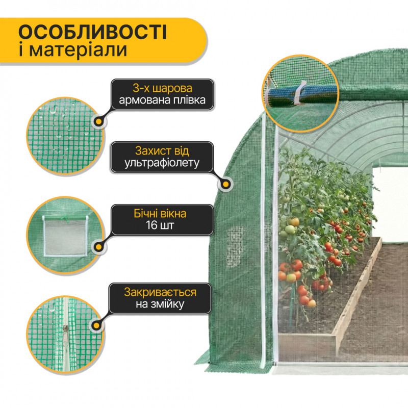 Теплиця оснащена двома рулонними дверима з москітною сіткою, які забезпечують зручний вхід, ефективну вентиляцію та надійний захист рослин від комах і шкідників. Додатково передбачено 16 вентиляційних отворів, що дозволяють регулювати температуру та вологість усередині теплиці.