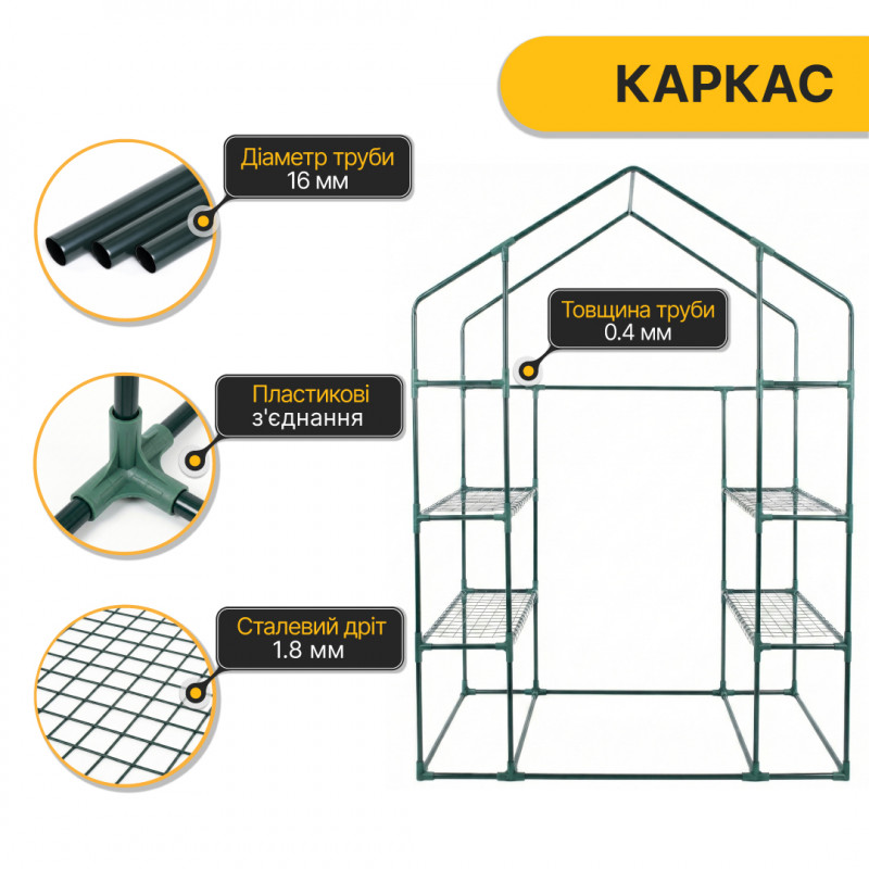 Міцний каркас виготовлений зі сталевих труб діаметром 16 мм з темно-зеленим порошковим покриттям, яке захищає метал від корозії та продовжує термін служби конструкції. Внутрішні полиці зі сталевого дроту діаметром 1,8 мм дозволяють зручно розміщувати рослини на різних рівнях.