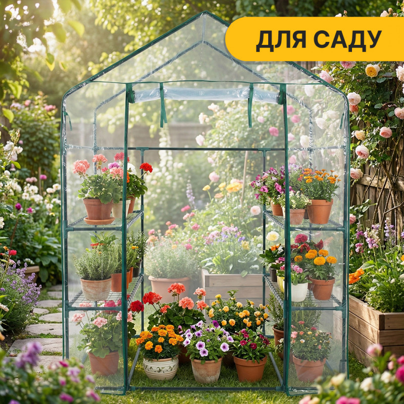Стелаж-теплиця LEOBRO — простора та функціональна теплиця для вирощування розсади, овочів, зелені й квітів у саду або на присадибній ділянці. Завдяки висоті 195 см у теплицю можна вільно зайти, що забезпечує максимальний комфорт під час догляду за рослинами.