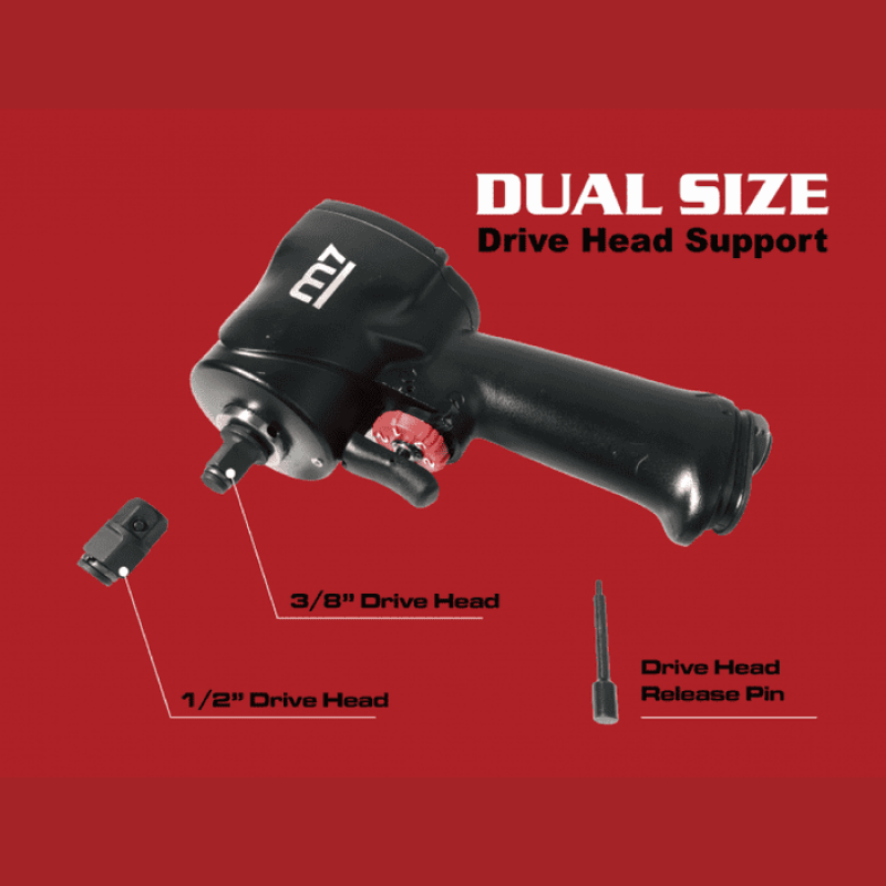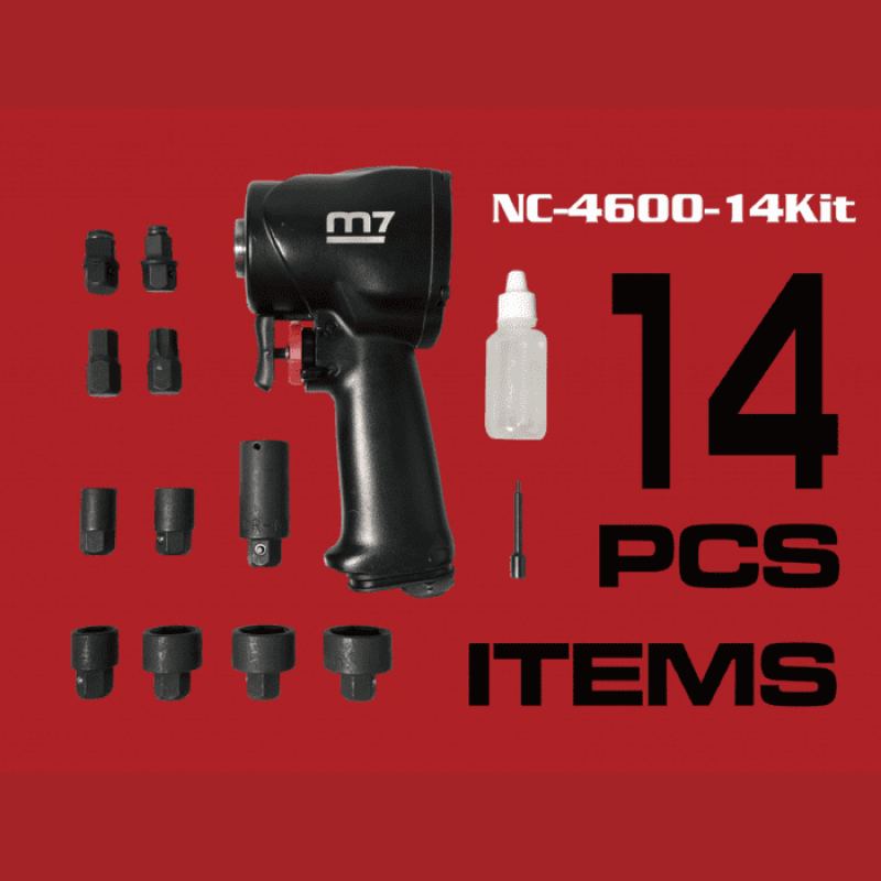 Mighty Seven NC-4600-14KIT - пневматичний ударний гайкокрут з набором аксесуарів для роботи і догляду за інструментом. Відмінною рисою даної моделі гайкокрута Mighty Seven є можливість змінювати робочий квадрат залежно від головок 1/2 "або 3/8". У моделі присутнє 3-ступінчасте регулювання крутного моменту на закручування і реверс. Максимальне зусилля крутного моменту становить 813 Нм для робочого квадрата 1/2" і 678 Нм для квадрата 3/8". У комплекті з гайкокрутом поставляються спеціальні ударні головки, які можна використовувати без квадрата, для зменшення загальної робочої довжини. Гайкокрут Mighty Seven NC-4600-14KIT поставляється в фірмовому захисному кейсі з ударними головками і аксесуарами