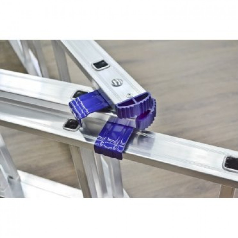 Сходи виготовлена з міцного алюмінієвого профілю товщиною 1,2 мм розмір - 60х20 мм, що дозволяє витримувати навантаження до 150 кг. Ніжки обладнані спеціальними заглушками, які запобігають ковзанню драбини по поверхні. Широка основа на одній зі сторін забезпечує стійкість сходах. Сходи надійно фіксується в робочому стані для безпечного використання.
