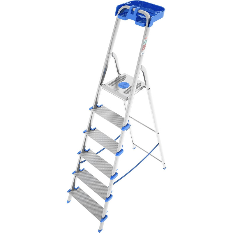 Драбина Colombo Atlantica 6 щаблів (S112A06P) - 100% алюмінієва драбина, що сертифікована відповідно до стандарту EN131. Загальна вага, яку витримує драбина 150 кілограмів. У комплекті з драбиною міцний лоток для інструменту, за допомогою якого можна кріпити та утримувати на висоті потрібні користувачеві інструменти при використанні драбини. Він витримує вагу до 5 кг. У вас завжди буде все необхідне для швидкої роботи. Великі алюмінієві щаблі мають глибину 12 см. Нековзка поверхня забезпечує підйом і спуск без ковзання. Механізм безпеки запобігає випадковому закриванню під час використання. Компактний розмір дозволяє легко зберігати, займаючи мінімальний простір.