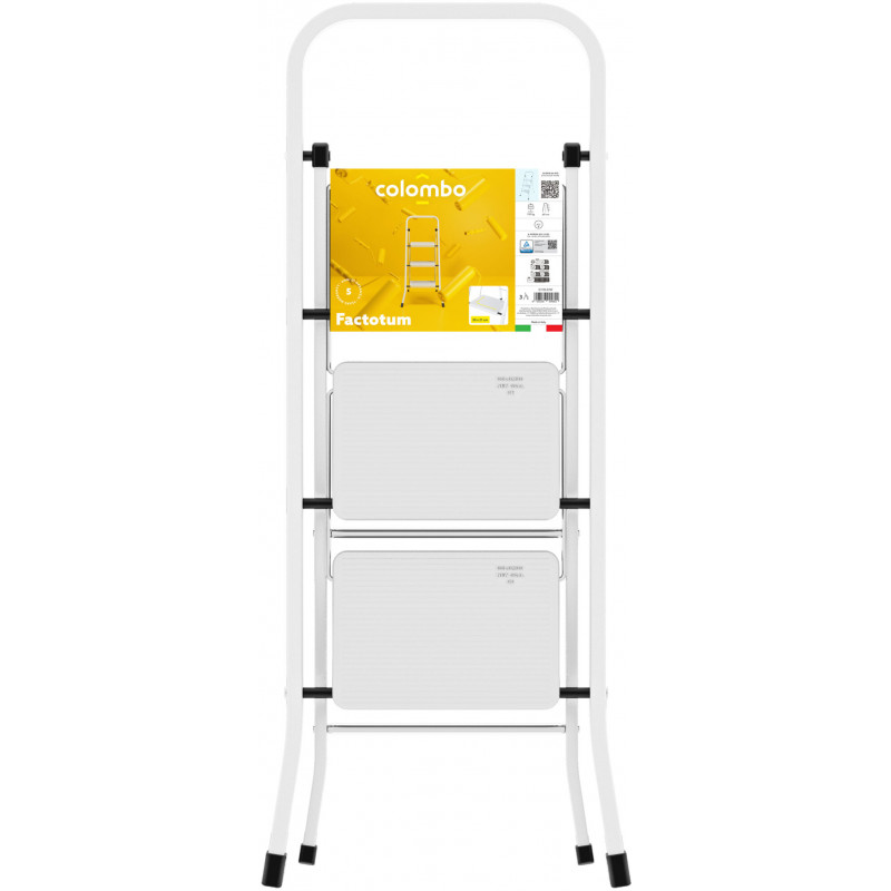 Драбина Colombo Factotum 3 щаблі (G110L03W) - міцна та надійна. Виготовлена в Італії відповідно до європейського стандарту якості EN 14183. Максимальне навантаження - 150 кг. Ідеально підійде тим, хто цінує практичність, легкість у використанні та стильний дизайн. Драбина має три зручних щаблі з антиковзним покриттям. Це гарантує безпеку ваших ніг при використанні драбини. Опорні ніжки з пластиковим захистом перешкоджають небажаному ковзанню. Складані щаблі забезпечують мінімальну товщину та максимальну компактність. Завдяки цій особливості, товщина драбини у складеному вигляді лише 5 см, тому у вас не виникне проблем із місцем для її зберігання.