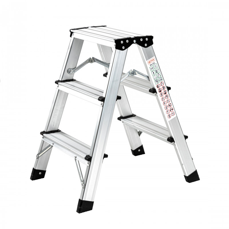 GTM KMH1203 - компактна алюмінієва драбина у формі двосторонньої стрем'янки, яка чудово підходить як для побутового, так і для професійного використання. У даній моделі драбини 3 сходинки і максимальна висота до верхньої сходинки 58 см.