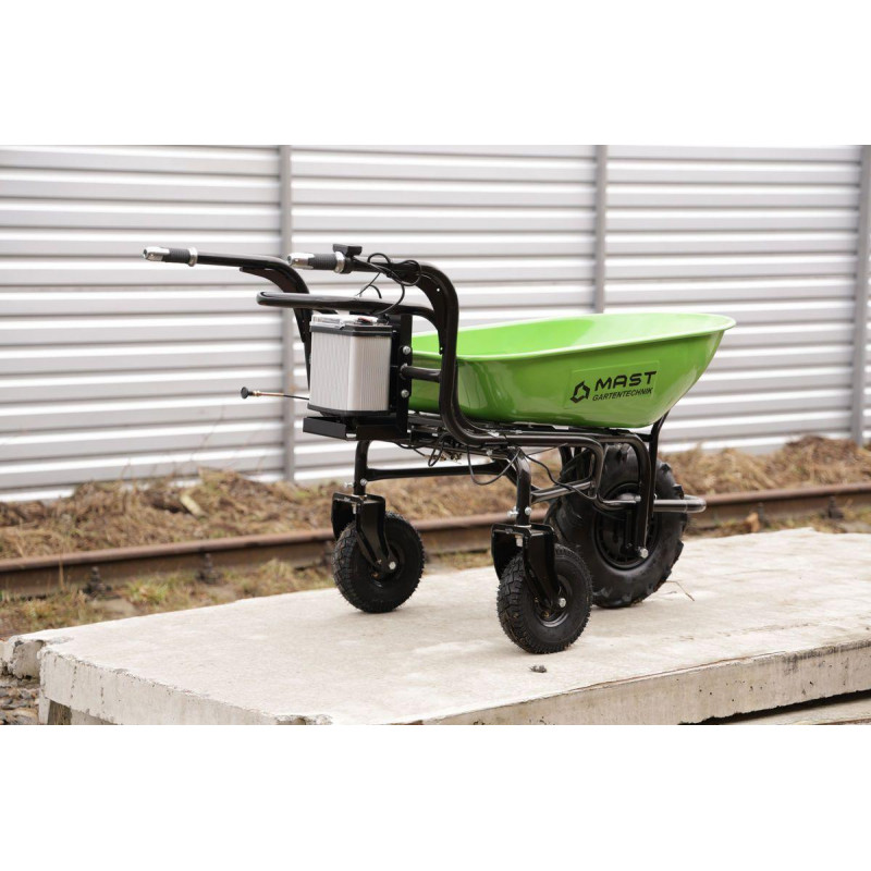 Велике ведуче колесо, оснащене електроприводом 280 В, та два опорних колеса забезпечують забезпечують маневреність тачки, її стійкість і прохідність на різних типах місцевості. Міцне 80-літрове корито з порошковим покриттям відкидається вперед для легкого вивантаження матеріалів. Якісні матеріали виготовлення і надійна конструкція гарантують зносостійкість і тривалий термін служби тачки.
