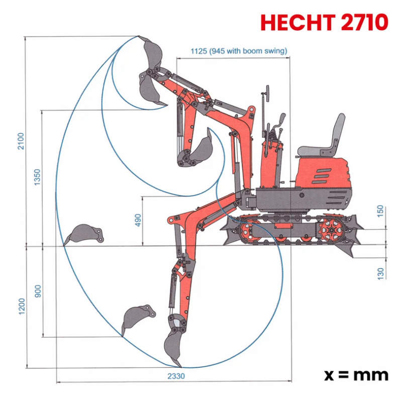 Міні-екскаватор HECHT 2710 — компактна гусенична техніка для виконання будівельних, монтажних і ландшафтних завдань. Відзначається продуманою конструкцією, стабільною роботою та точною гідравлікою, що забезпечує ефективну роботу в обмежених умовах — від підготовки траншей до облаштування ділянок і прокладання комунікацій.