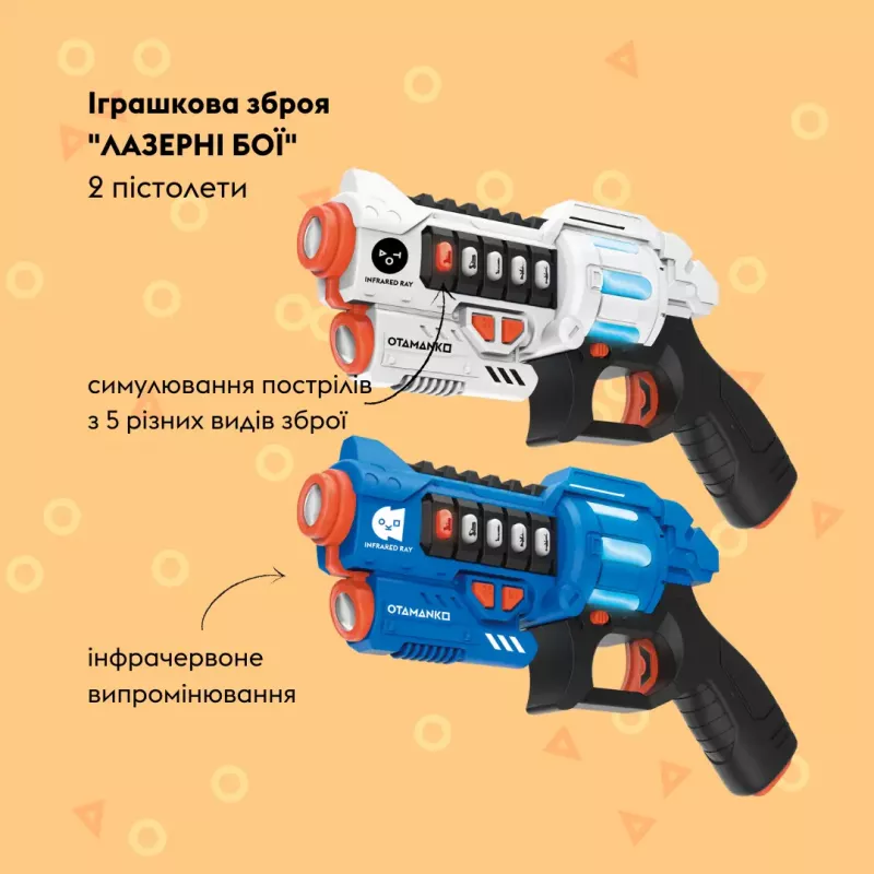 Привіт, друзі! Отаманчик запрошує на драйвові баталії з набором "ЛАЗЕРНІ БОЇ" ТМ OTAMANKO! У комплекті два пістолети, які працюють на інфрачервоному випромінюванні та дарують реалістичні світлові й звукові ефекти. Ви можете обирати один із п’яти режимів зброї – від пістолета до кулемета – і змагатися у командах до 4 гравців. Це гра, яка перетворює будь-який двір чи кімнату на справжнє поле бою, повне сміху, азарту та адреналіну!