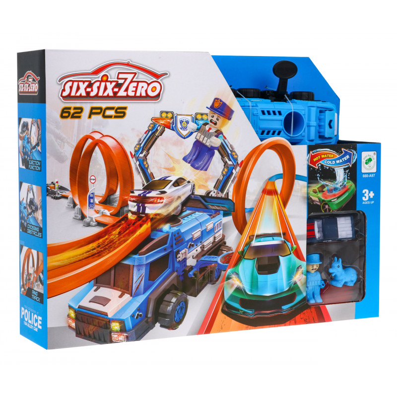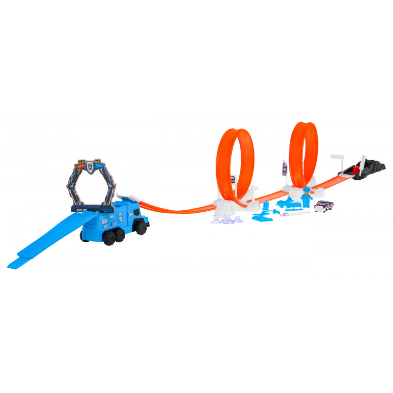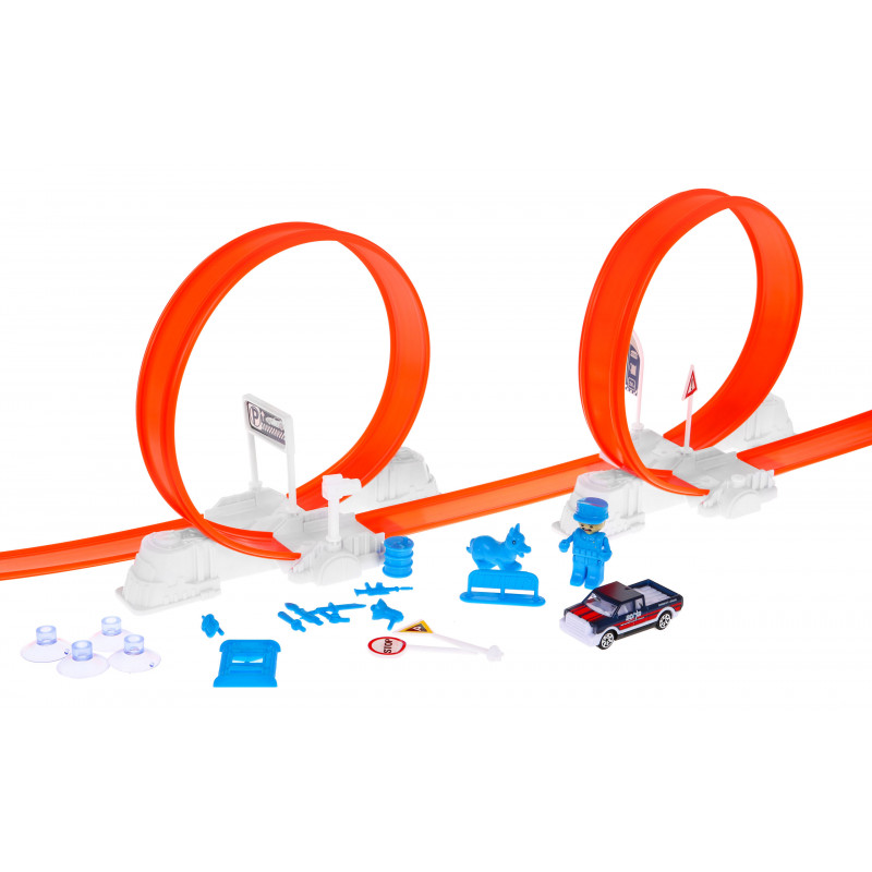 Велика екстремальна траса для самостійного збирання - ідеальний подарунок для дітей від 3 років, які люблять гонки. Набір складається з цілих 62 елементів , з яких можна побудувати довгу трасу з 2 петлями на 360 градусів і вантажівку з ручним пусковим пристроєм іграшкової машинки. Закінчується ралі бігом з обручем і катанням на вантажівці .