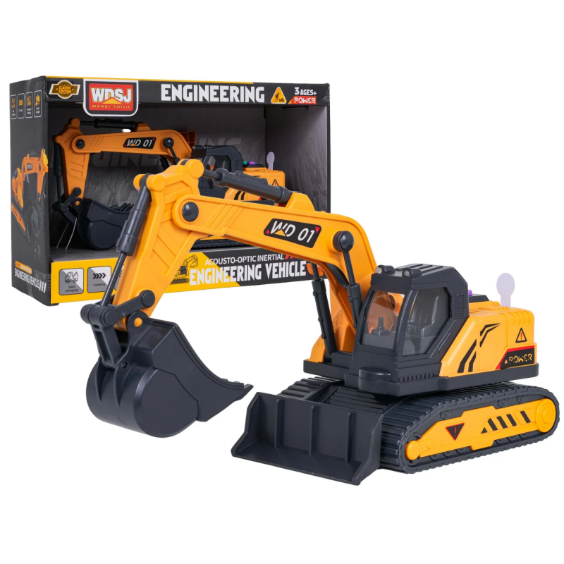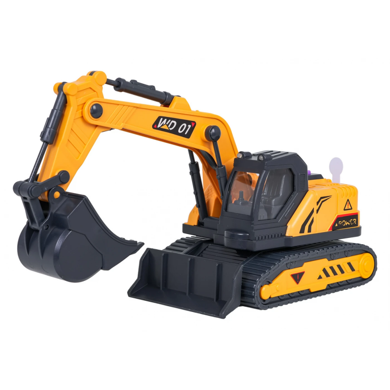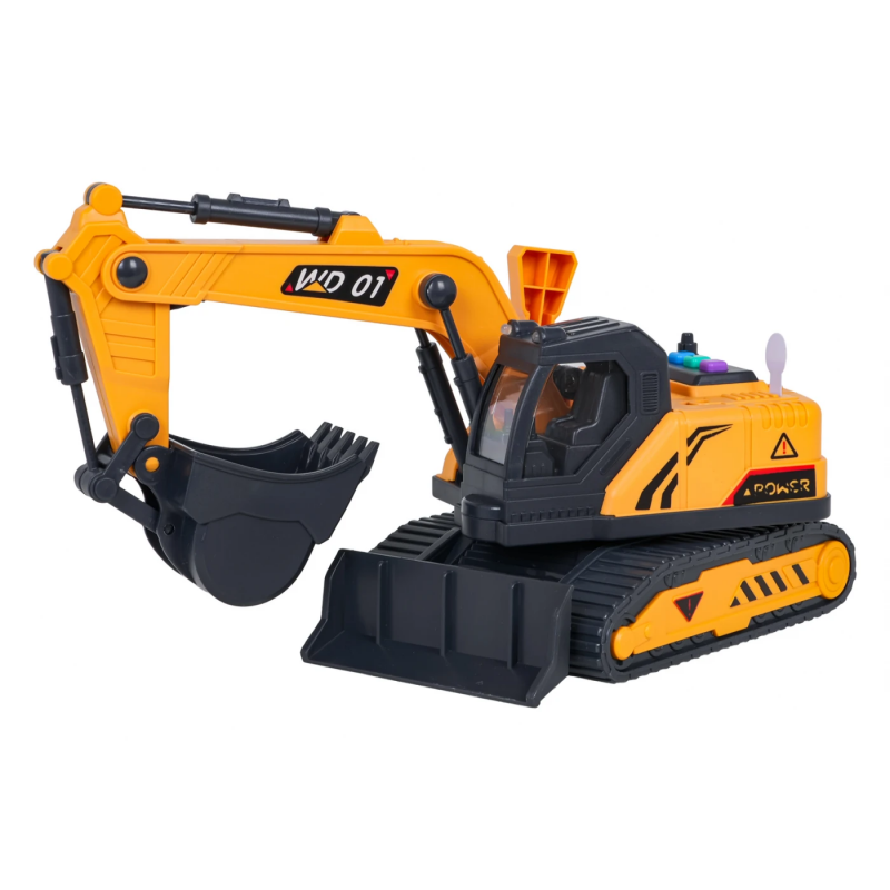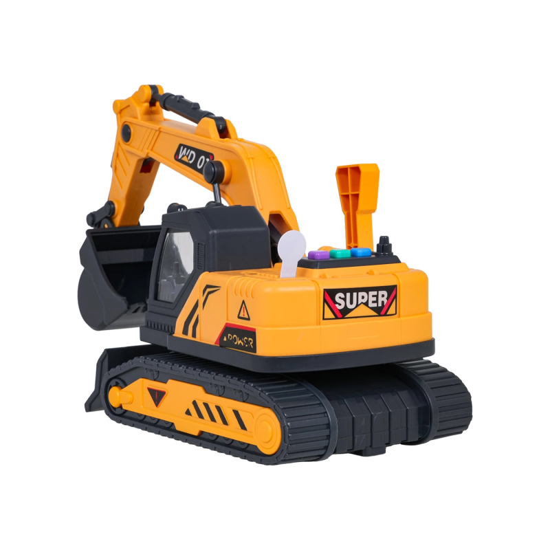 Екскаватор оснащений рухомим ківшем, поворотною кабіною та основою, що обертається на 360 градусів, що дозволяє вільно маневрувати машиною під час гри. На даху транспортного засобу розташована панель з кнопками, що запускають реалістичні звуки: звук запуску транспортного засобу, роботи двигуна та руху заднім ходом. Крім того, іграшка оснащена миготливими вогниками, які активуються під час роботи. Живлення забезпечують три батарейки типу AG13, що входять до комплекту.