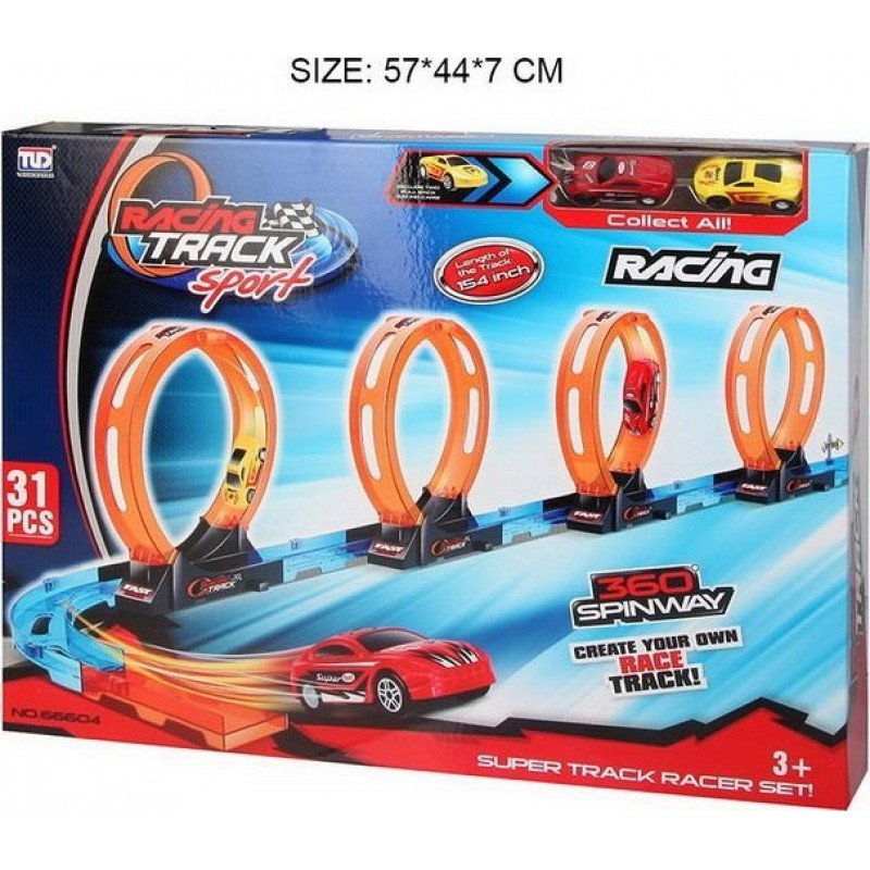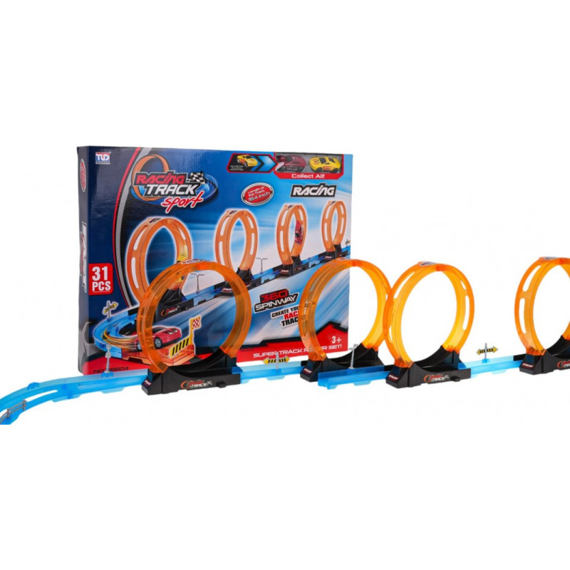 Оснащений 4 петлями на 360 градусів і яскравими кольорами, набір вражає своїм дизайном і гарантує захоплюючу поїздку. Міцна конструкція з високоякісного пластику забезпечує тривале задоволення, а динамічне розташування доріжок заохочує творчу гру з повною потужністю.