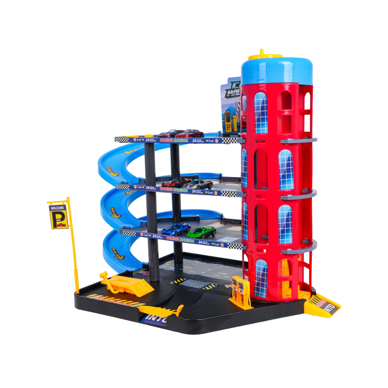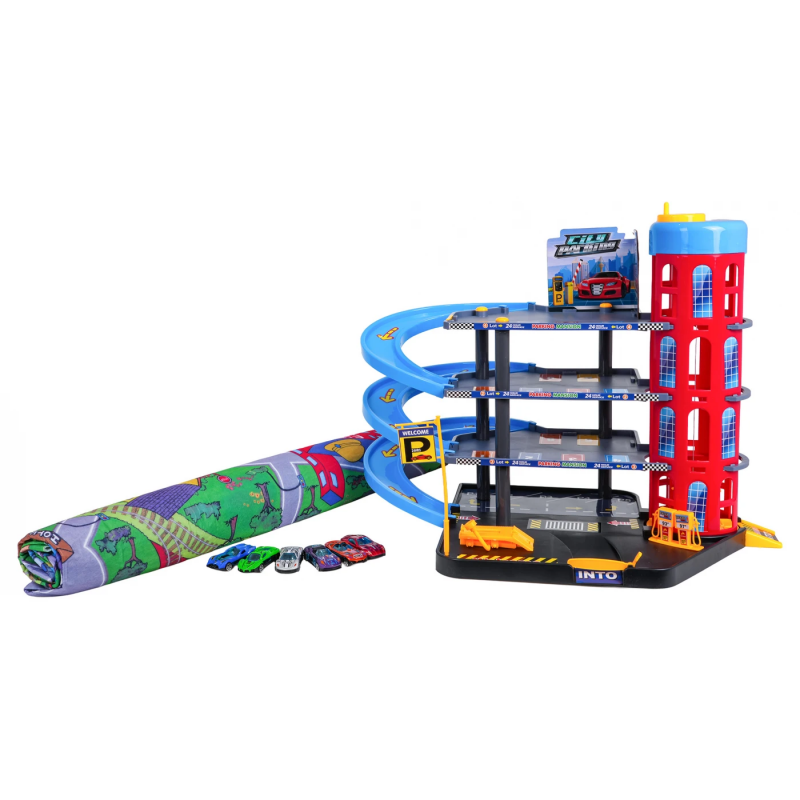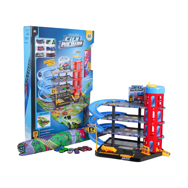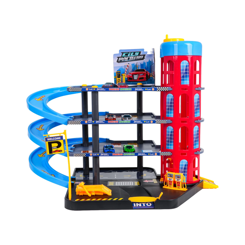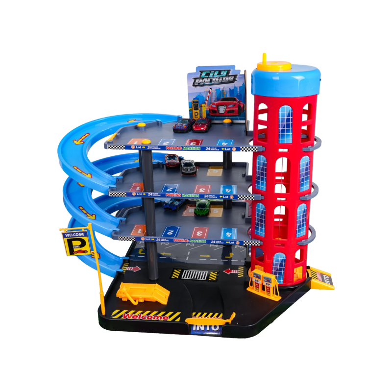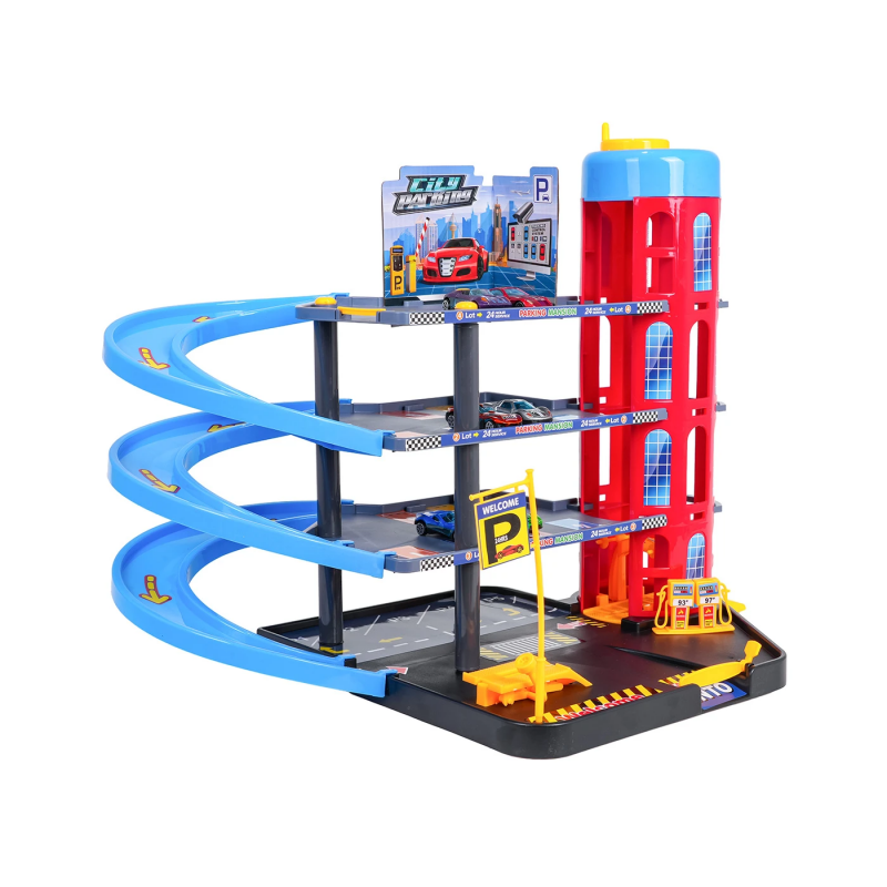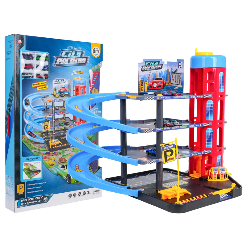 Набір містить велику багаторівневу паркувальну конструкцію з паркувальними місцями, заправною станцією, підйомником для автомобілів та ручним ліфтом, що працює за допомогою ручки. Кожен рівень з'єднаний з окремою гіркою, що дозволяє машинкам швидко та ефектно спускатися вниз.