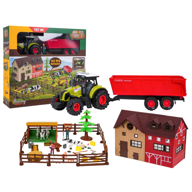 Трактор має від'ємний причіп з можливістю підйому, що дозволяє завантажувати та транспортувати фігурки або тварин. Доповненням є відкриваються двері сараю та загон, які допомагають дитині розігрувати сценки та створювати власні історії. Все виготовлено з міцного, безпечного пластику в яскравих кольорах.