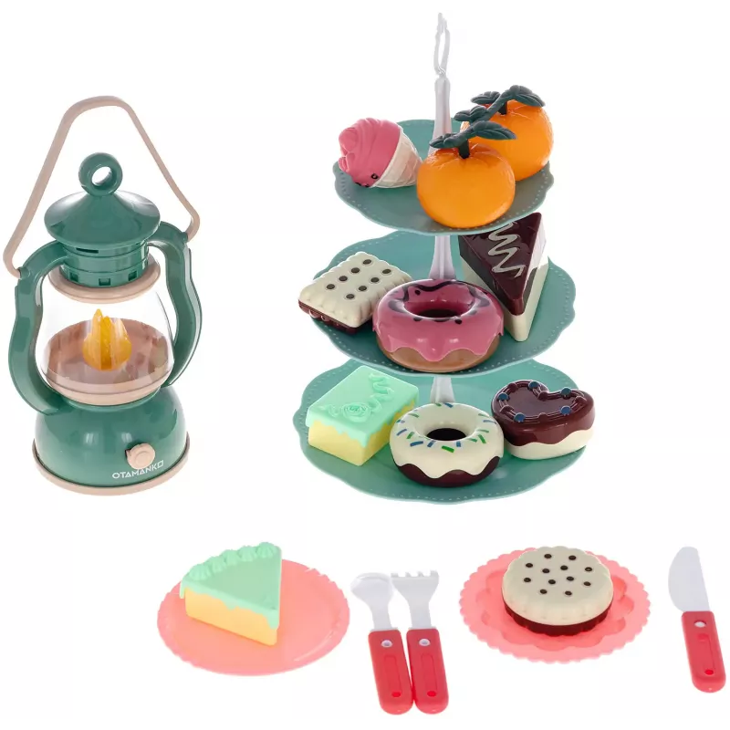 | Комплектація | До набору входять 23 елементи: тістечка х8; морозиво в ріжку х1; апельсини на гілочці х1; тарілка х1; тарілка з візерунком х1; підставка для десертів (7 елементів) х1; ложка х1; виделка х1; ніж х1; лампа х1 |