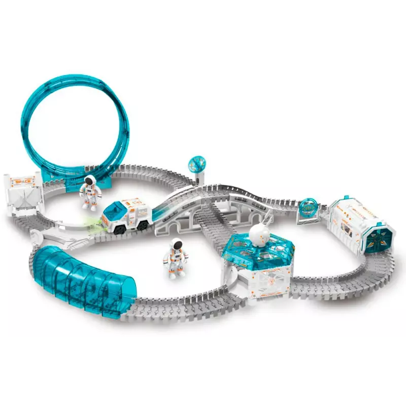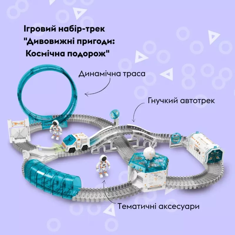 Космос чекає! Створи свою міжгалактичну трасу з тунелями, обертами та невідомими планетами. У наборі — ракета, прибульці, супутники та світлові ефекти. Трек гнучкий і легко трансформується — як справжня орбіта! Для дітей, які мріють про зірки та мандрівки Всесвітом.