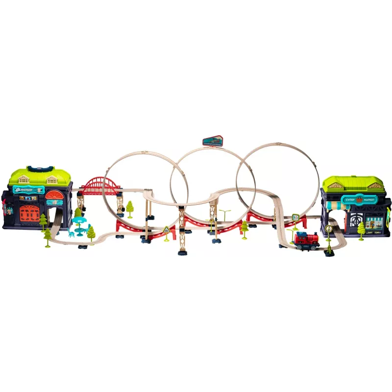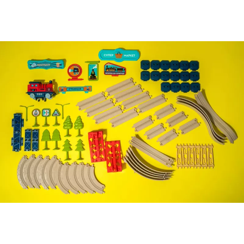 | Комплектація | 137 елементів; Коробка-будиночок; Залізниця; Паровозик; Додаткові елементи (знаки, дерева); Інструкція на зворотній стороні пакування |