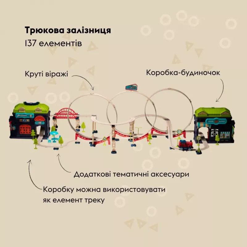 Привіт, на зв`язку ваш друг Отаманчик, і маю для вас щось особливе — трюкову залізницю "Хоробрий Паровозик"! Спершу побудуйте захопливу трасу з крутими спусками, підйомами, «мертвими петлями» та різнорівневими ділянками, а потім маленький паровозик вирушить у цікаву подорож! Усі деталі залізниці зручно складаються у валізку у формі будиночка, який легко зберігати та переносити. Валізка також стає частиною траси, додаючи нові рівні для гри! А щоб зробити гру ще цікавішою, ви можете з’єднувати кілька наборів і будувати масштабні маршрути. З "Хоробрим Паровозиком" пригоди гарантовані!