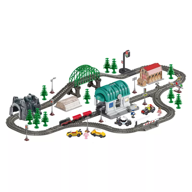 У наборі 108 елементів — усе, щоб збудувати яскраву залізницю з тунелем, мостами та зупинкою, що світиться. Потяг із магнітними вагончиками мчить колією зі звуками справжнього руху та може змінювати напрям за твоїм маршрутом.
