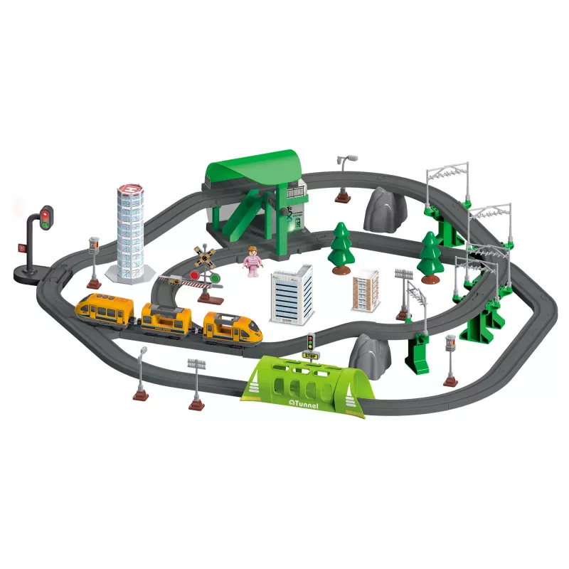 На тебе чекають 98 деталей, з яких можна збудувати цілу залізницю з тунелями, мостами та зупинками, що світяться. Потяг із магнітними вагончиками легко з’єднується і мчить уперед із реалістичними звуками руху. А ще — тунель із підсвіткою, фігурки, дерева та машинки, щоб створити свій власний світ пригод.