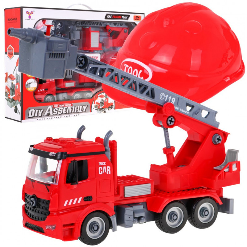 Для хлопчиків, які мріють стати пожежниками, у нас є відмінний набір пожежна машина 2 в 1 і каска. Пожежна машина повинна бути зібрана з конструктивних деталей, в комплект входять шурупи та інструменти. Візок має знімний, розсувний і поворотний на 180 градусів підйомник з кошиком. Додатковою атракцією пожежної команди є висувна та поворотна драбина з водометом на кінці. Іграшка має звукові та світлові функції. Автомобіль видає звуки сирени, клаксона та звук запуску двигуна. Звуки супроводжуються миготливими вогниками. У набір входить шолом, щоб ваша дитина відчула себе справжнім пожежником.
