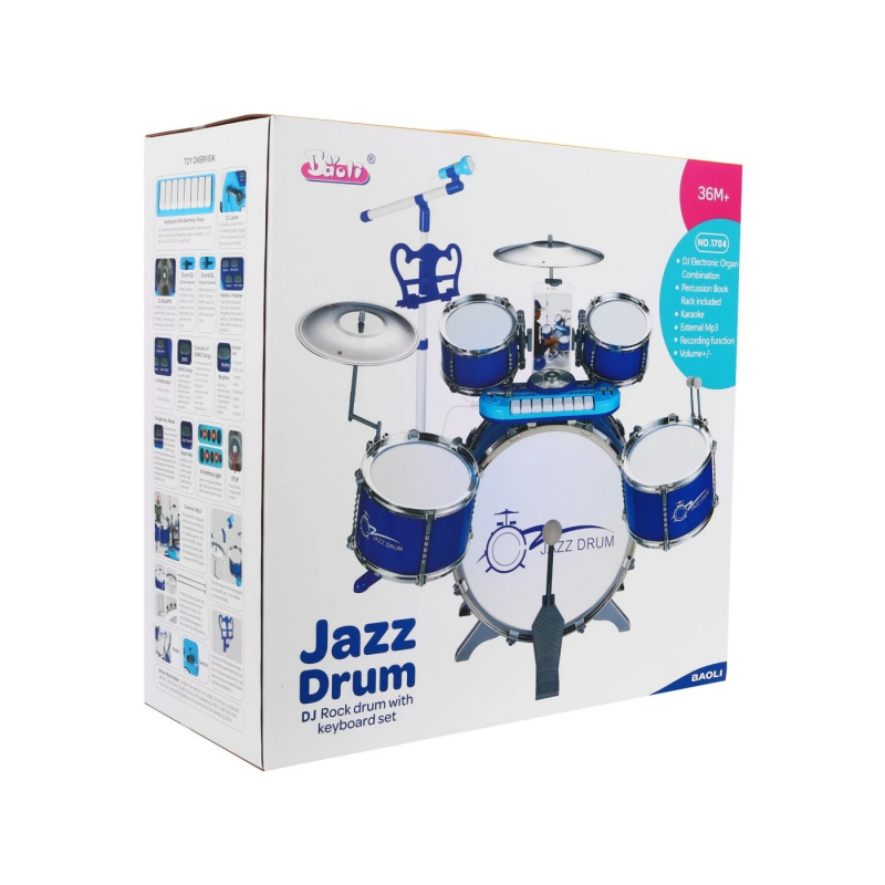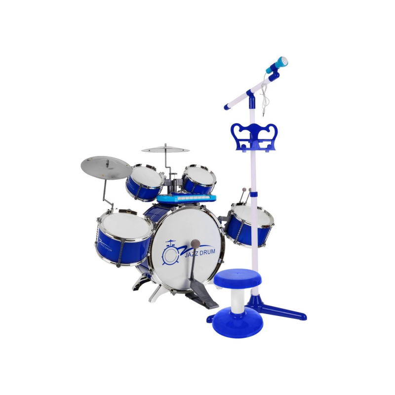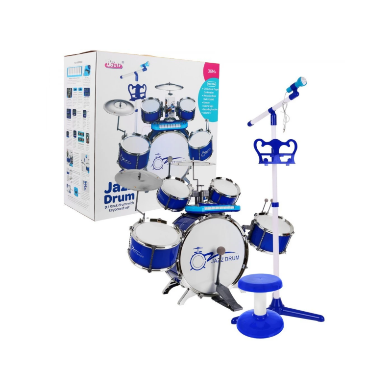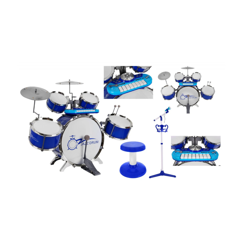 До складу багатого набору входить велика 5-барабанна ударна установка, клавіатура з DJ-консоллю та мікрофон на штативі. Щоб дитині було зручно грати, до набору додано також стабільний стілець для сидіння.