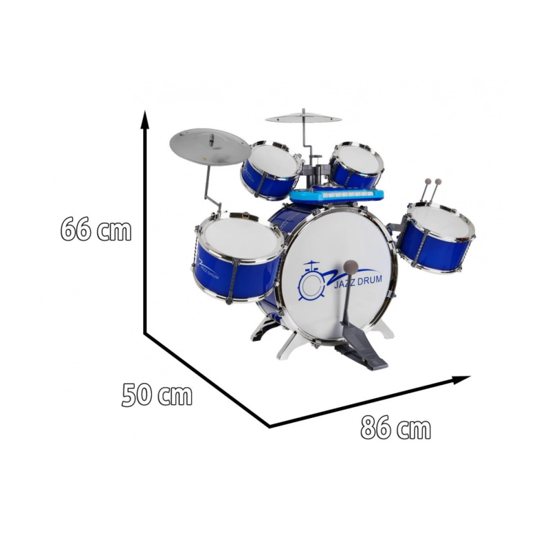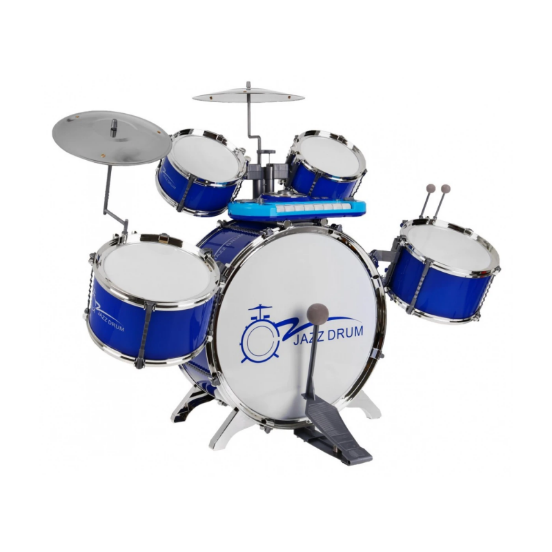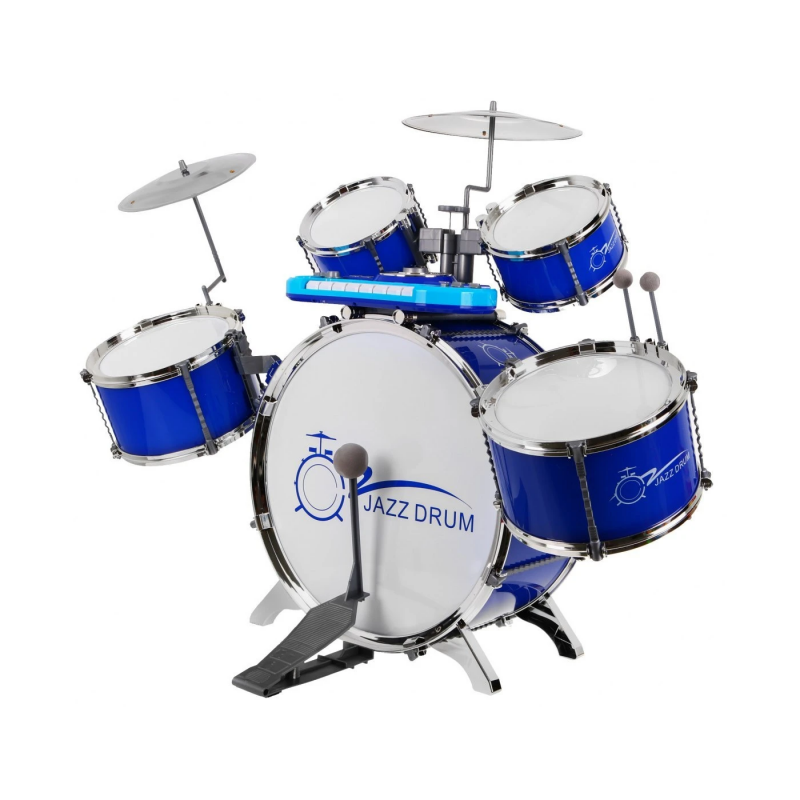 Барабанна установка складається з великого бас-барабана з педалею. Є також по 2 барабани середнього і маленького розміру, в комплект також входять 2 тарілки та 2 палички для гри на барабанній установці, які закінчуються м'якою піною, безпечною навіть при експресивному ударі.
