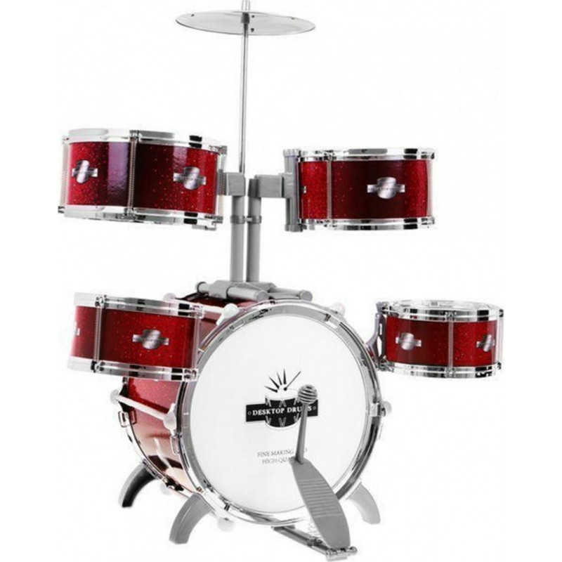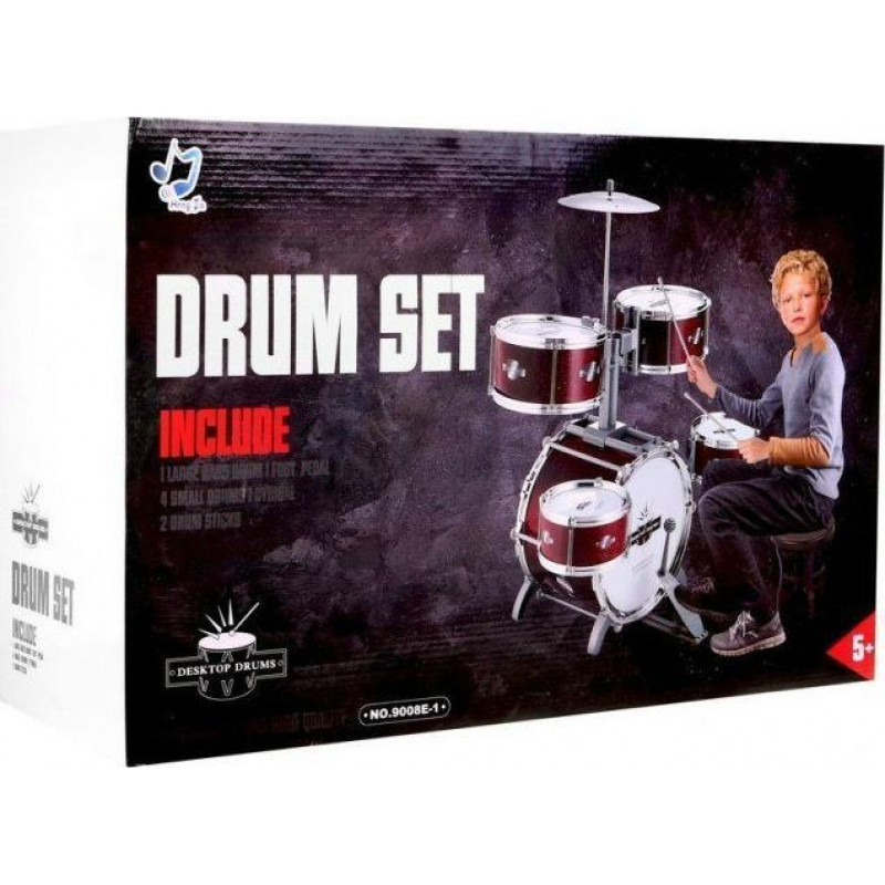 Музичний набір з 5 барабанів, включаючи великий бас-барабан з бочкою, а також 2 середніх і 2 малих барабана. Також є 2 пластини з міцного пластику. Гра проводиться за допомогою 2 палиць, що входять у комплект , кожна з яких має наконечник, який захищає маленького музиканта та барабани. Останній елемент набору - зручна табуретка чорного кольору , подвійно посилена для більшої стійкості.